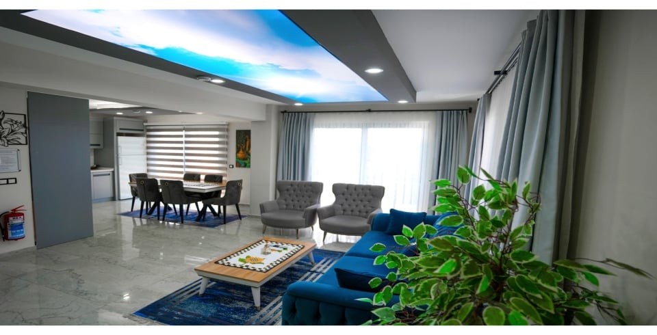 Salon: Özenle döşenmiş salon, modern koltuklar, 8 kişilik yemek masası, LCD TV ve klima bulunmaktadır.