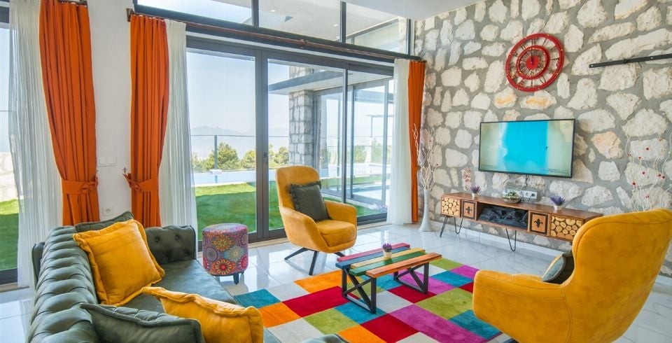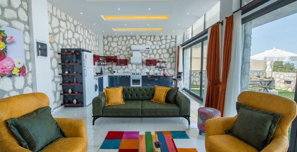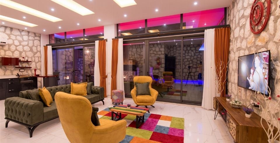 Salon : Villa Gökkuşağının salonunda sizi şık bir oturma grubu ile klima, televizyon, internet, uydu, koltuk, sehpa ile ferah bir salon bekliyor olacaktır. Havuz terasına çıkış yapılmaktadır.