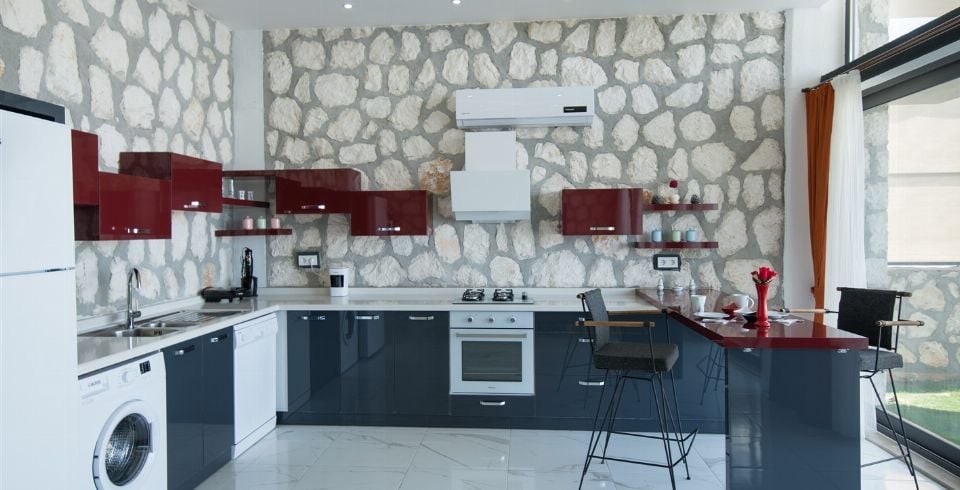 Mutfak : Villamızın geniş Amerikan mutfağı ile sizlere kendi evinizin mutfağı gibi hissettirecek. Ayrıca mutfakta klima, bulaşık makinası, buzdolabı, çamaşır makinası, mikrodalga fırın, tost makinası, ekmek kızartma, su ısıtıcısı, fırın, 4'lü ocak seti ve 2 kişilik yemek masası ile tava tencere vb. mutfak araç gereçlerini kullanma fırsatını sizlere sunuyoruz.