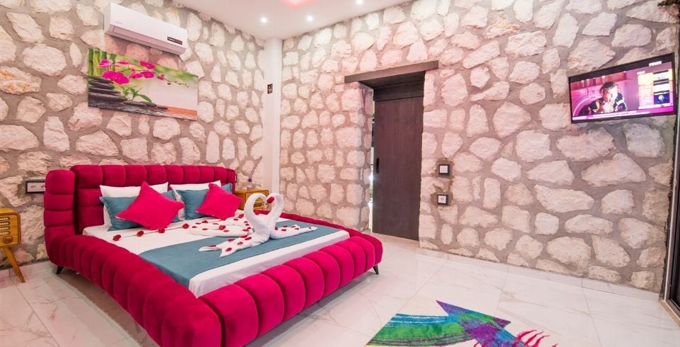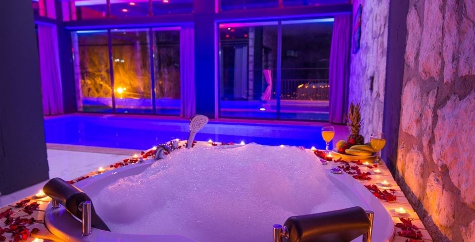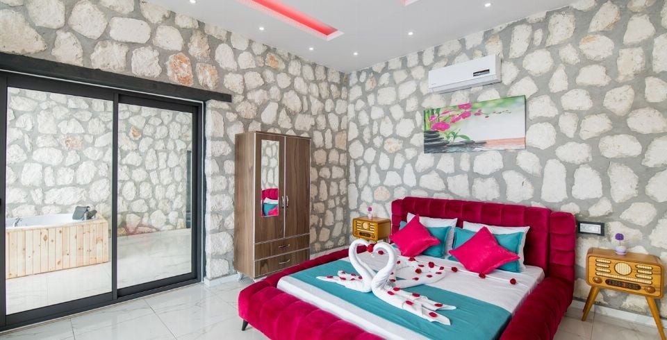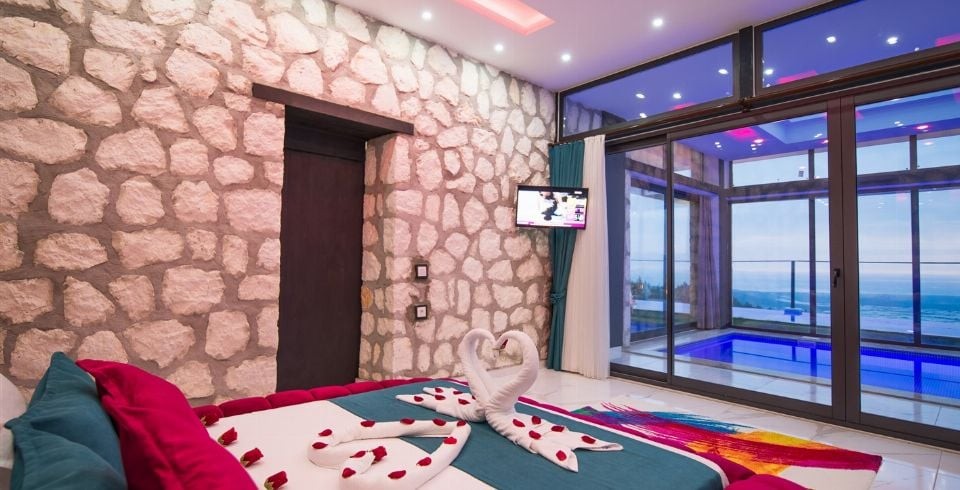Yatak Odası : 1 adet çift kişilik yatak, kapalı ısıtmalı havuz, televizyon, klima, jakuzi, komodin, elbise dolabı, makyaj masası, banyo ve lavabo bulunmaktadır.