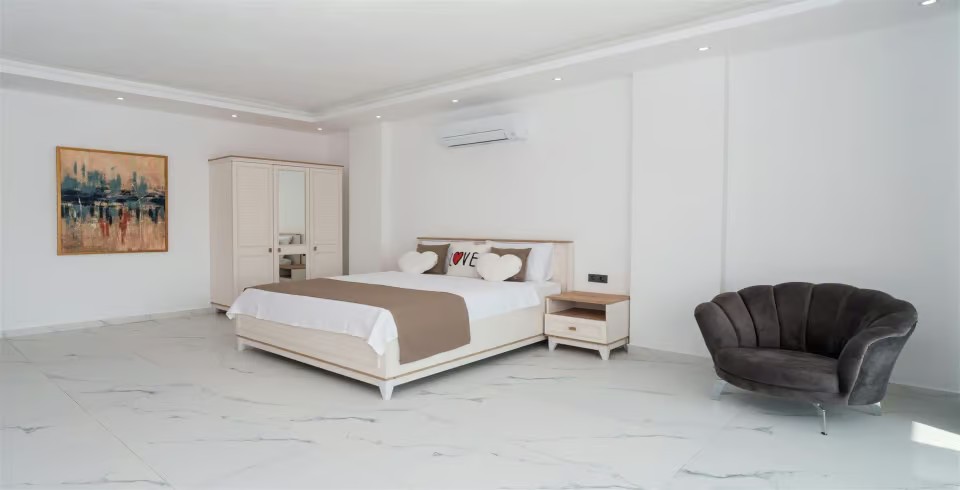 4. Yatak Odası : Çift kişilik yatak, klima, elbise dolabı, makyaj masası, komodin, banyo ve WC bulunmaktadır.