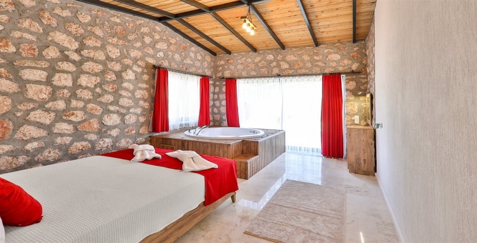 1. Yatak Odası : Çift kişilik yatak, klima, komodin, makyaj masası, jakuzi, banyo ve lavabo bulunmaktadır.
