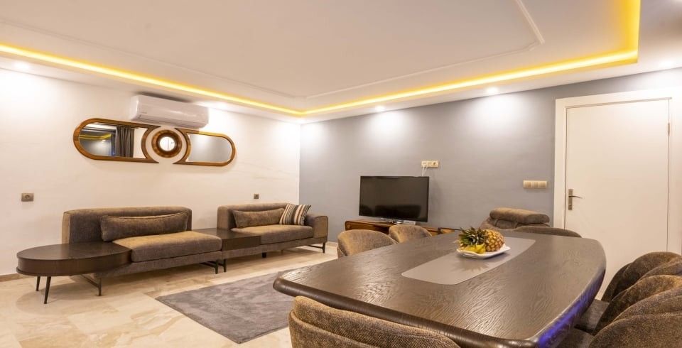 Salon : Oturma grubu, uydu, TV, DVD, klima, yemek masası bulunmaktadır. Ayrıca salondan havuz başına çıkış vardır.