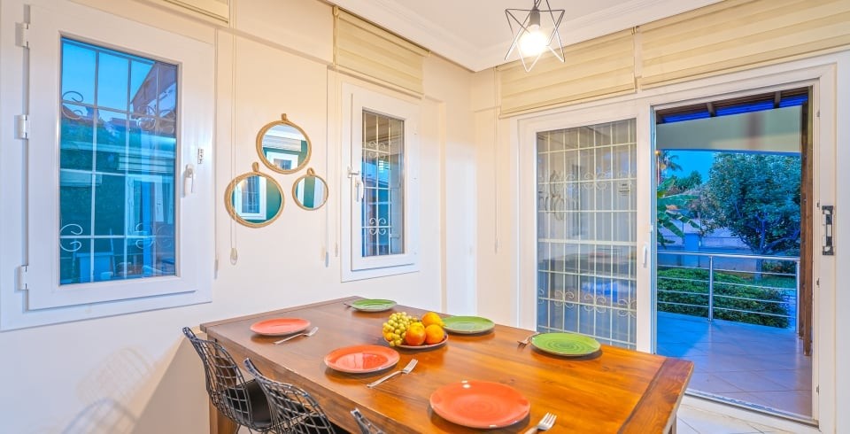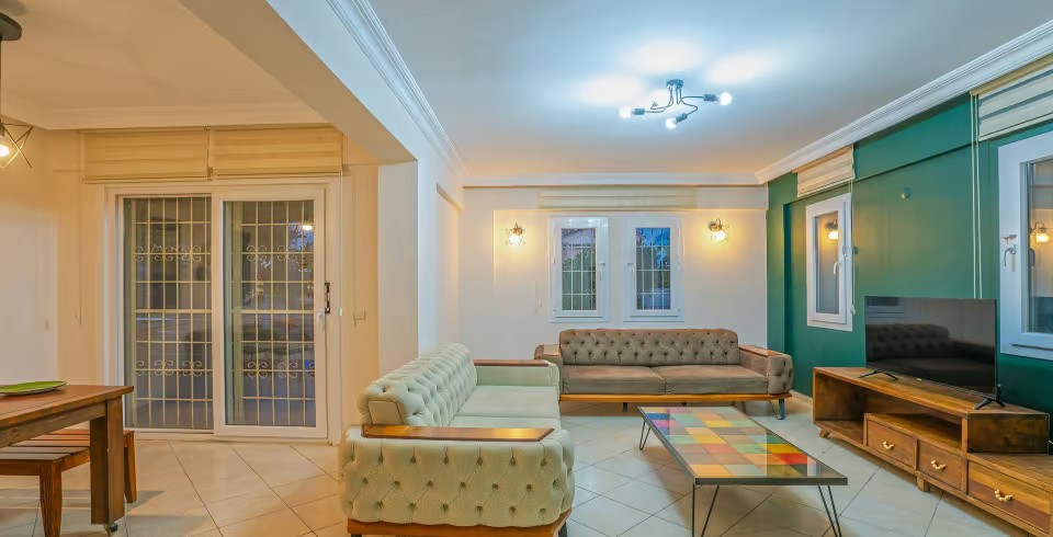 Salon: 2 adet oturma grubu, 6 kişilik  yemek masası, LCD TV, uydu alıcısı, DVD player, klima, salondan havuza çıkış  bulunmaktadır.