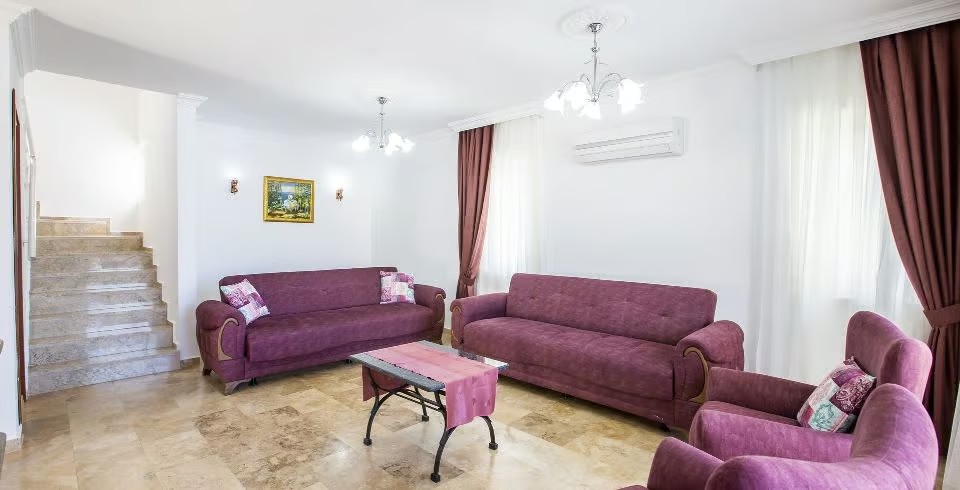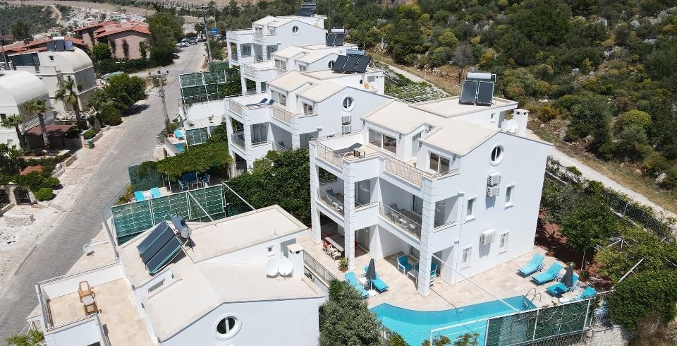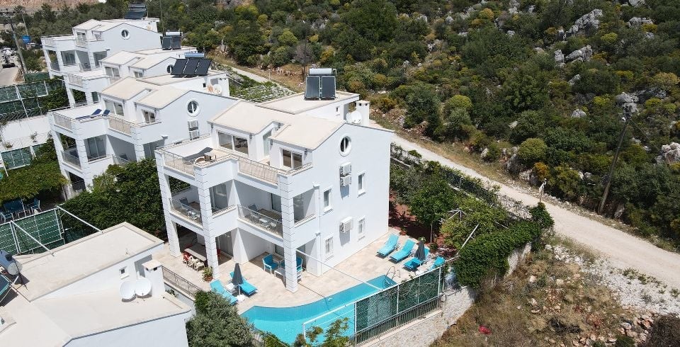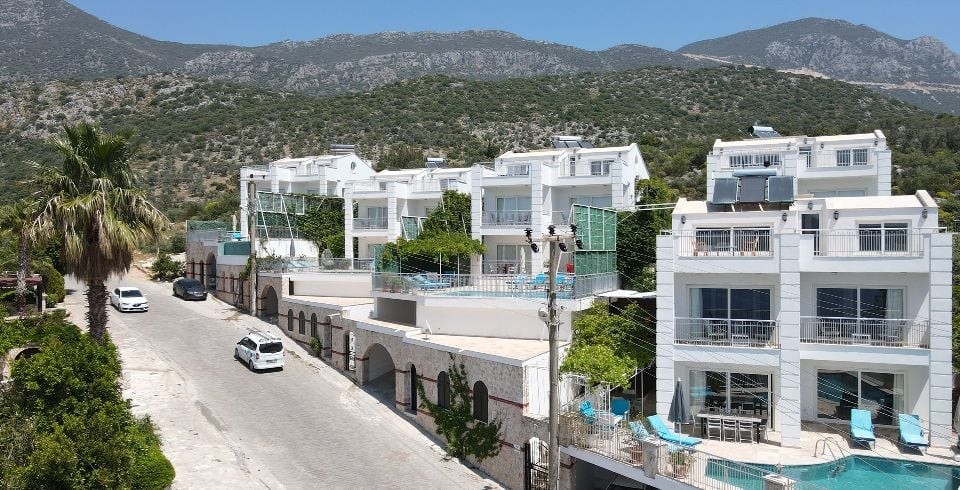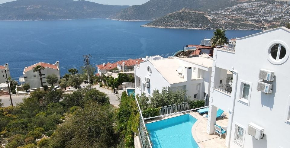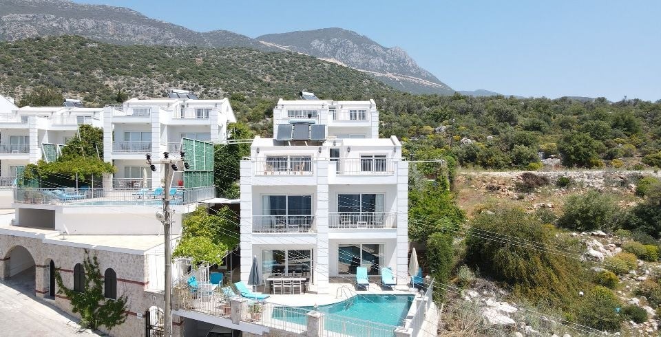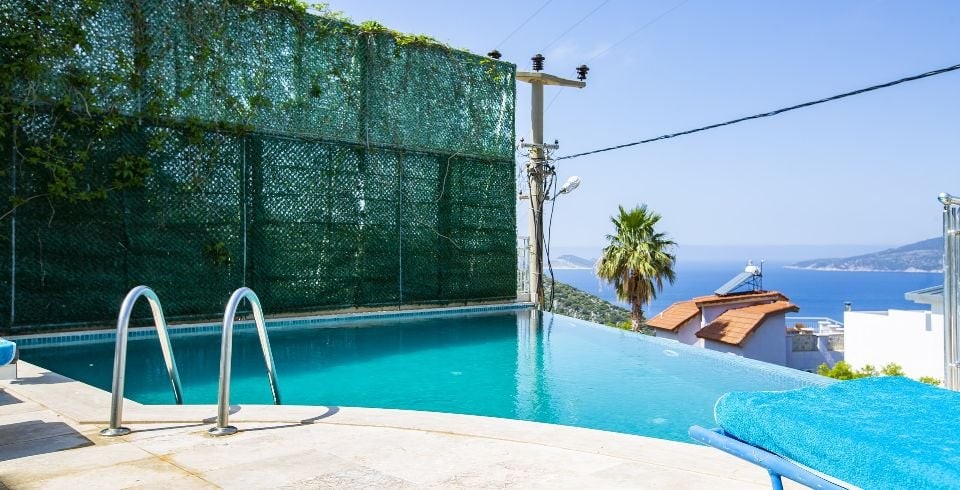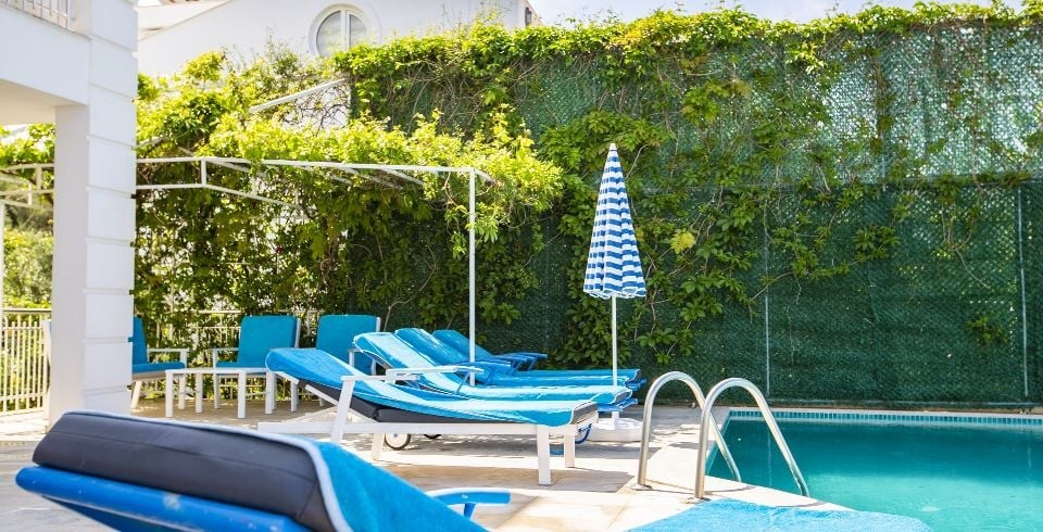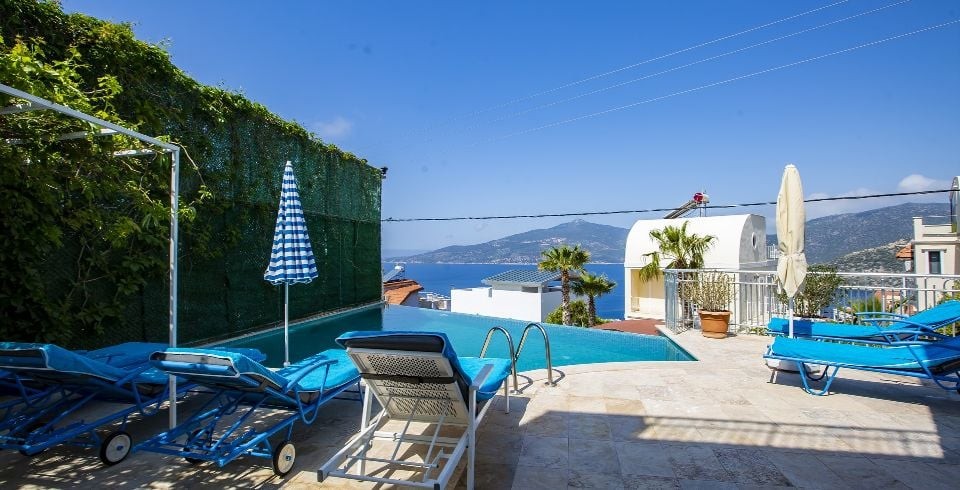 Dış mekanda yer alan özel yüzme havuzu, güneşlenme terası, şezlonglar, oturma alanı ve barbekü köşesi, Kalkan’ın sıcacık havasında keyifli günler geçirmenizi sağlar. Havuz alanı, çevresindeki yeşil doku ve deniz manzarasıyla birleştiğinde huzur dolu bir tatil atmosferi yaratır.