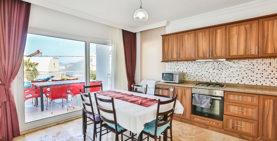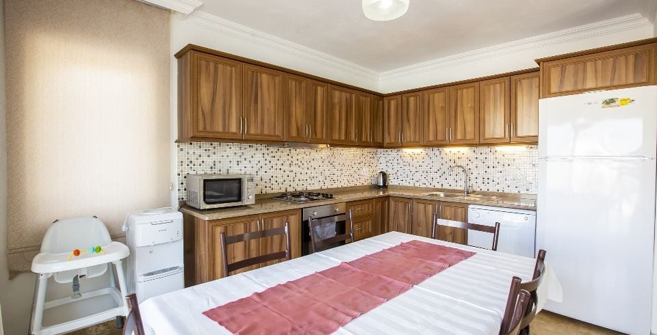 Mutfak: Deniz manzaralı Amerikan mutfak Detayları; Buzdolabı, çamaşır makinası, bulaşık makinası, yemek masası, su sebili, su ısıtıcısı, ekmek kızartma makinası, fırın,4'lü ankastre ocak, mikro dalga ve mutfak araç gereçleri bulunmaktadır.