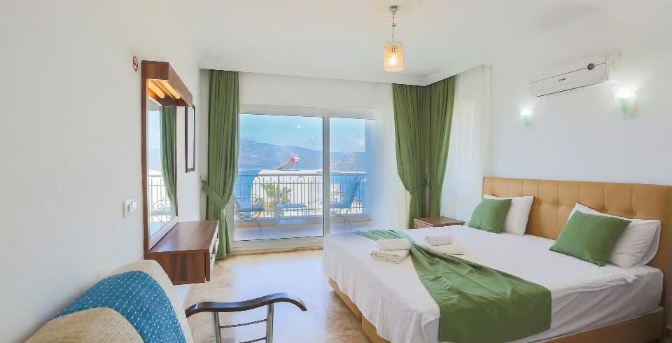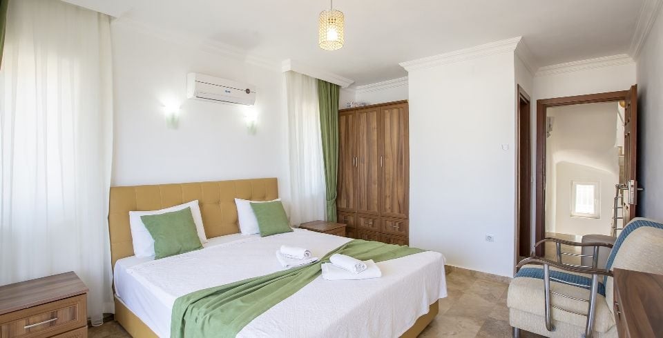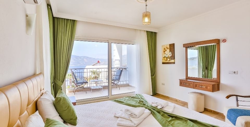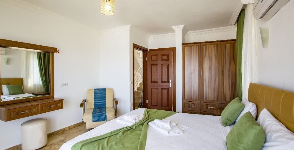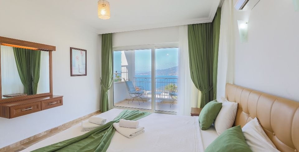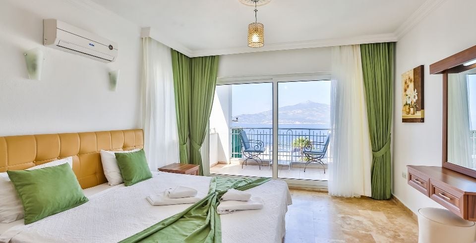 1. Yatak Odası : Çift kişilik yatak, klima, elbise dolabı, komodin, makyaj masası, banyo ve lavabo bulunmaktadır. Deniz manzaralı balkon bulunmaktadır.