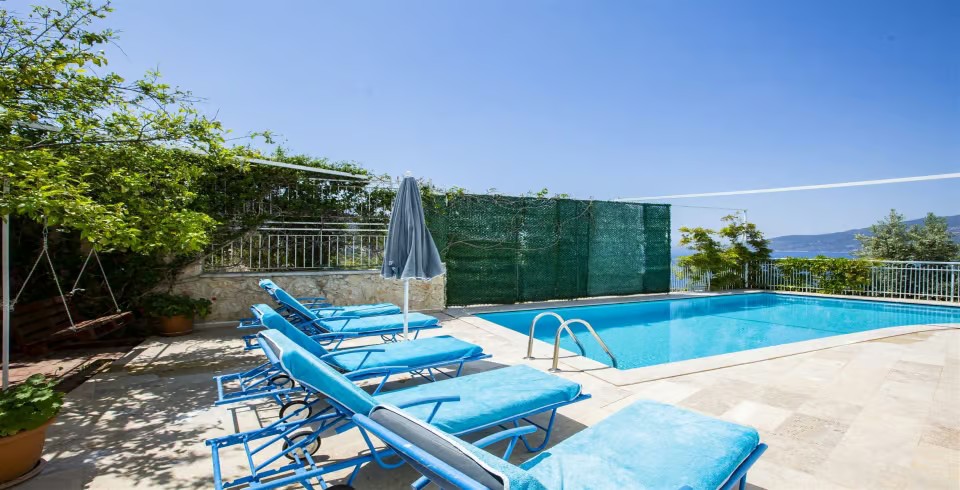 Villa Baysal 5’in dış alanı, Kalkan Körfezi’ni panoramik şekilde gören özel bir yüzme havuzuna, güneşlenme terasına ve oturma alanına sahiptir. Havuz çevresi korunaklıdır, bu sayede mahremiyete önem veren aileler için de uygundur. Misafirler dilerse havuz başında serinleyebilir, dilerse bahçedeki barbekü alanında keyifli akşamlar geçirebilir.