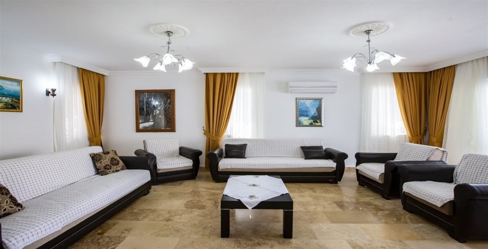 Salon : Deniz manzaralı modern Salona sahip olup TV, uydu, oturma grubu, DVD, internet, klima, WC ve lavabo bulunmaktadır.