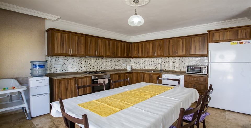 Mutfak : Deniz manzaralı Amerikan mutfak Detayları; Buzdolabı, çamaşır makinası, bulaşık makinası, yemek masası, su sebili, su ısıtıcısı, ekmek kızartma makinası, fırın, 4'lü ankastre ocak, mikro dalga ve mutfak araç gereçleri bulunmaktadır.