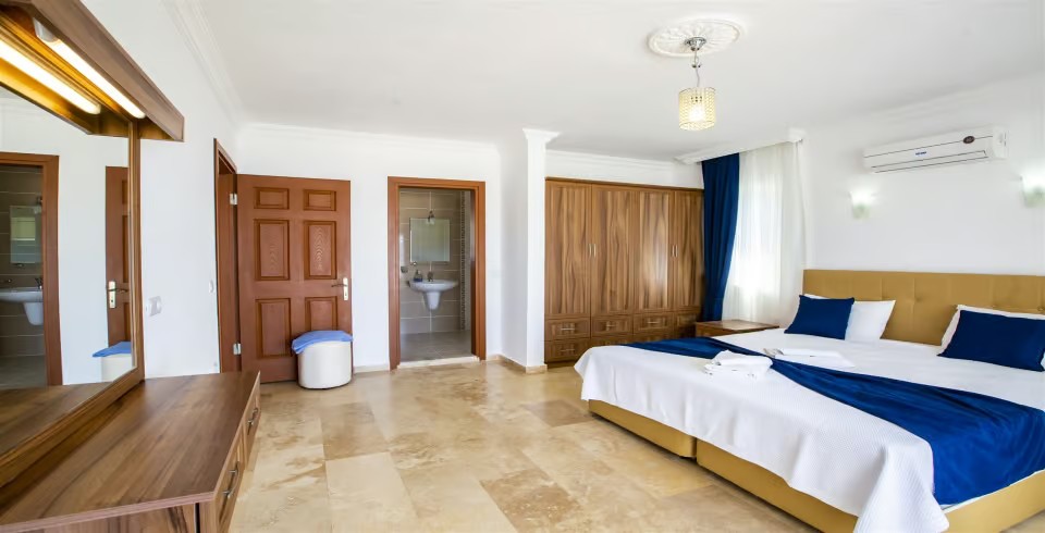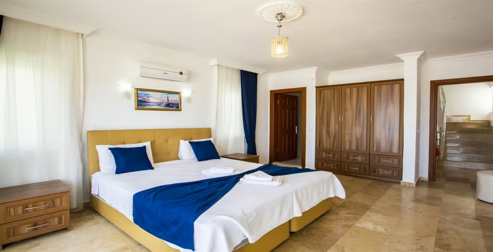 Villanın üst katlarında yer alan 4 klimalı yatak odasının ikisinde çift kişilik, diğer ikisinde ise ikişer tek kişilik yatak bulunmaktadır. Odaların tamamı özenle dekore edilmiş, ferah ve aydınlıktır. Bazı odalarda ebeveyn banyosu, makyaj masası ve dolap alanı bulunur. Tüm odalarda temiz nevresim ve havlu takımları misafirlerin kullanımına sunulmuştur.