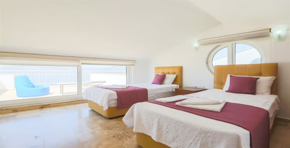 4. Yatak Odası : 2 adet tek kişilik yatak, klima, elbise dolabı, komodin, makyaj masası, ortak kullanım banyo ve lavabo bulunmaktadır. Deniz manzaralı teras bulunmaktadır.