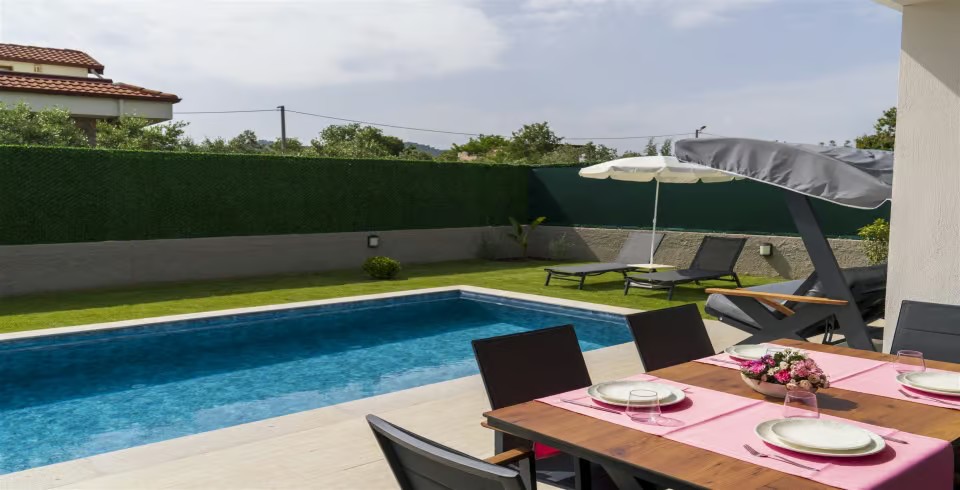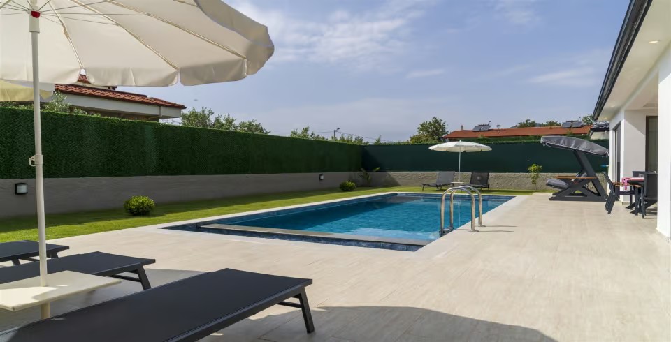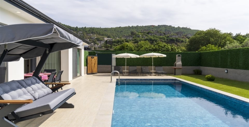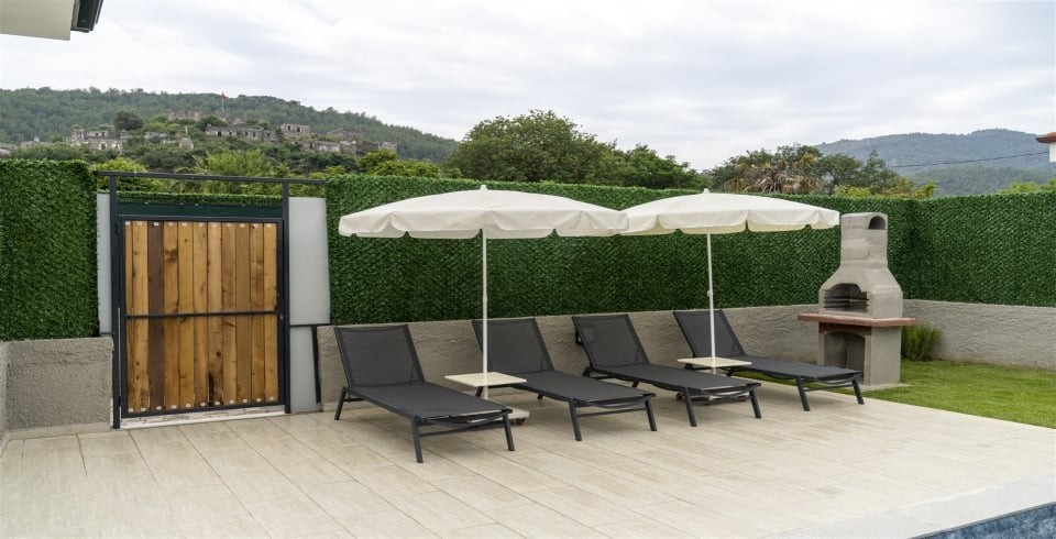 Havuz Ve Bahçe : Villamızın havuzu  korunaklı olup dışarıdan gözükmemektedir.Havuz terasında şezlong , şemsiye,  oturma grubu ve barbekü bulunmaktadır.