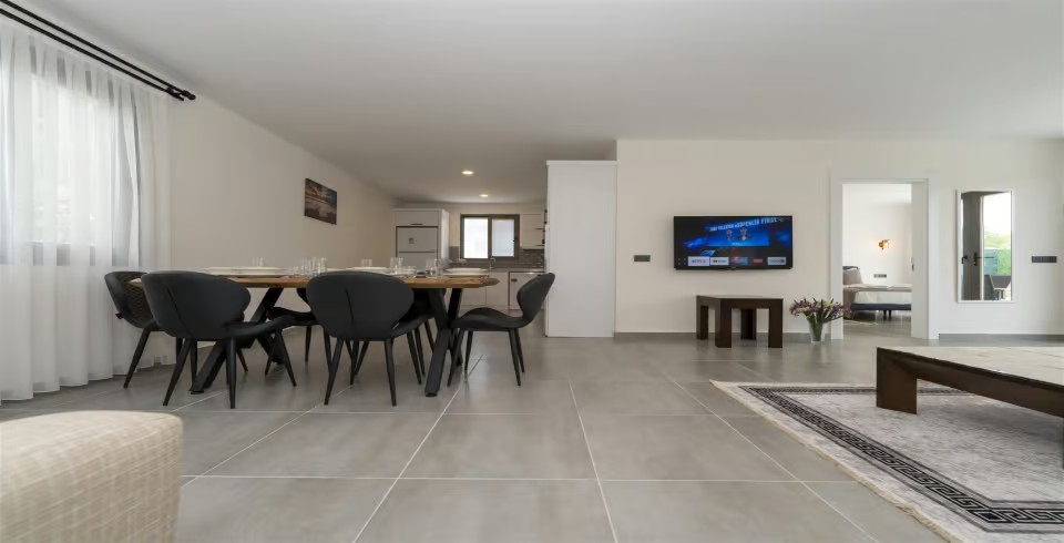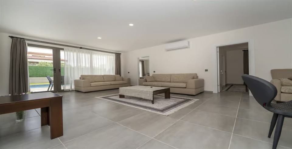 Salon : Villamızın salonu havuz başına çıkışlı olup salonumuzda Oturma grubu, yemek masası , TV, klima bulunmaktadır.