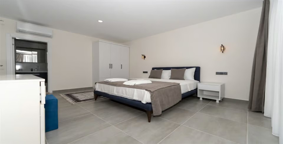 1. Yatak Odası : Çift kişilik yatak, klima, komodin, elbise dolabı, makyaj masası, banyo ve lavabo bulunmaktadır.