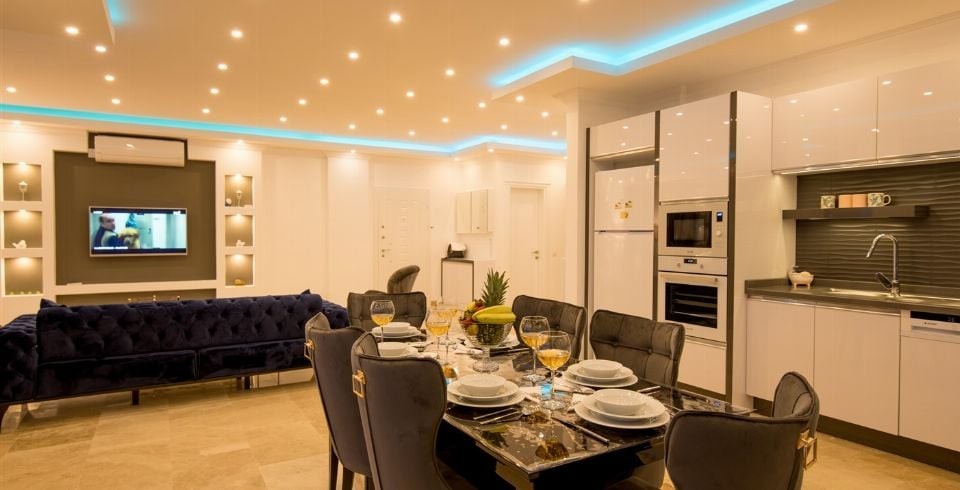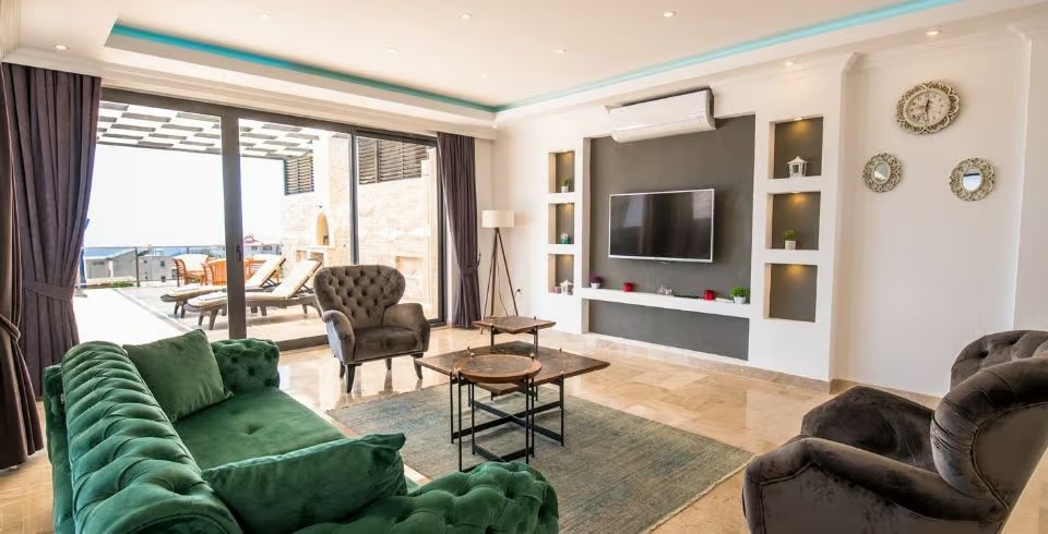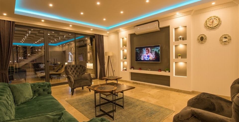 Salon : Oturma grubu, televizyon, uydu alıcısı, sehpa, klima, elektrik süpürgesi, ütü ve ütü masası bulunmaktadır. Havuz terasına çıkış mevcuttur.