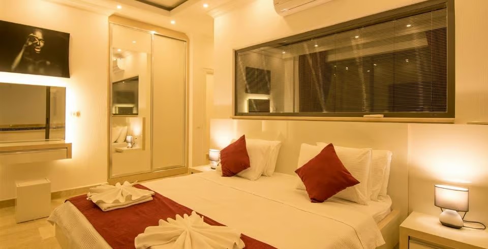 1.Yatak Odası : Süit yatak odasıdır. 1 adet çift kişilik yatak, elbise dolabı, makyaj masası, komodin, saç kurutma makinası, klima, jakuzi, kapalı havuz, banyo ve tuvalet bulunmaktadır.