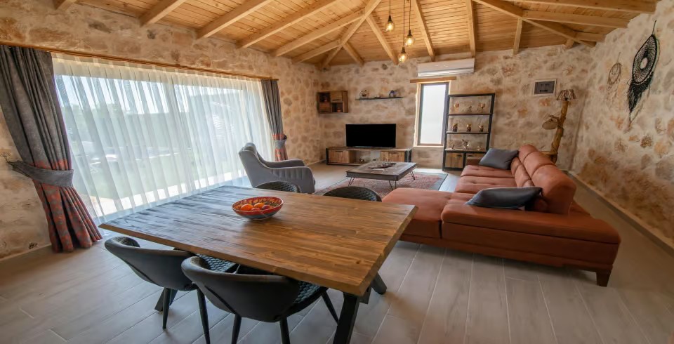 Salon: Villa salonunda konforlu oturma grubu, klima, TV, internet, uydu alıcı, yemek masası, sehpa bulunmaktadır.