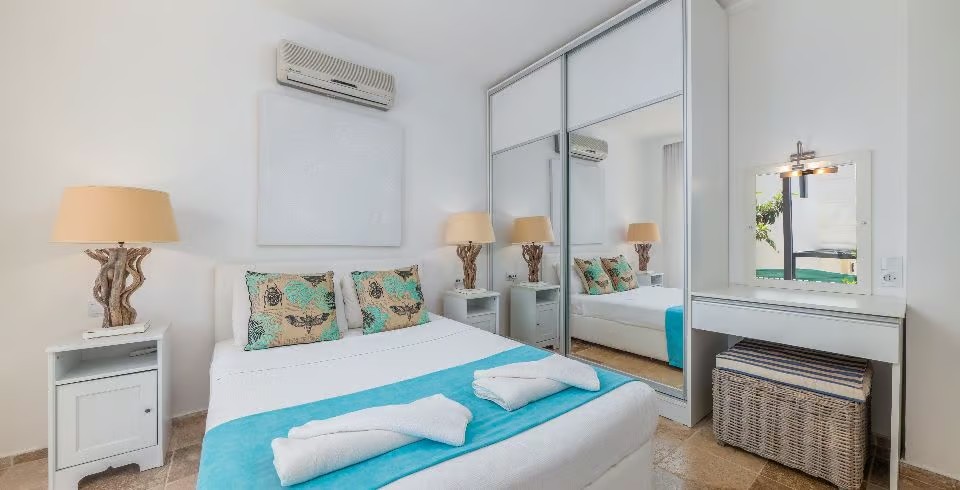 1. Yatak Odası : Çift kişilik yatak, klima, elbise dolabı, komodin, makyaj masası, banyo ve lavabo bulunmaktadır.