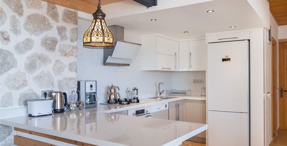 Mutfak: Villamızın mutfağında Amerikan mutfak 6 kişilik yemek takımı, buzdolabı, çamaşır makinası, mikrodalga fırın, 4'lü ocak, ekmek kızartma makinası, ketıl, çatal bıçak takımı, tencere tava takımı, bulaşık makinası bulunmaktadır.