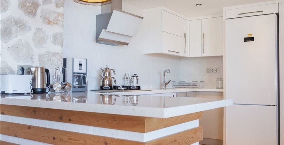 Villa Bills’in salonu, açık plan mutfakla birleşen geniş bir yaşam alanı olarak tasarlanmış. Tam donanımlı mutfakta buzdolabı, bulaşık makinesi, fırın, mikrodalga, ocak ve yemek takımı gibi ihtiyaç duyulan tüm ekipmanlar mevcut. Konforlu oturma grubu, televizyon ve panoramik deniz manzarasına açılan sürgülü cam kapılarla donatılmış salon, ferahlığıyla dikkat çekiyor.