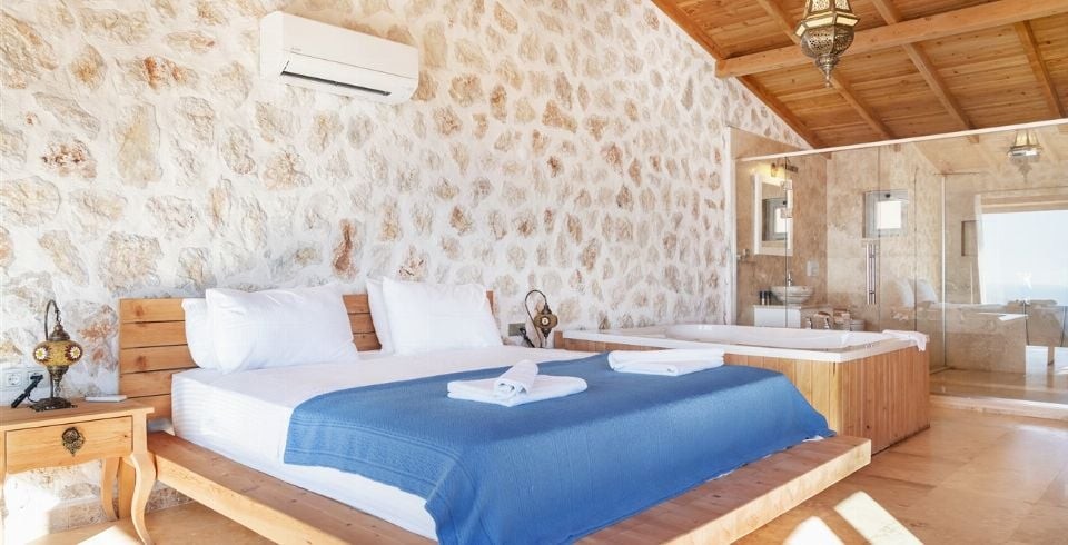 Villada toplam üç yatak odası bulunuyor ve altı kişiye kadar konaklama kapasitesine sahip. Zemin katta yer alan yatak odalarından biri iki tek kişilik yataklı, diğeri çift kişilik yataklı olarak düzenlenmiş. Her iki odada da ebeveyn banyosu, gardırop, makyaj masası ve havuz terasına açılan geniş cam kapılar yer alıyor. Üst katta ise, villanın en dikkat çekici alanı olan ana yatak odası bulunuyor. Bu oda; geniş jakuzi, özel balkon ve muhteşem gün batımı manzarasıyla konuklara lüks bir konaklama deneyimi sunuyor.