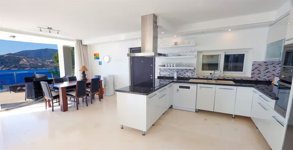 Mutfak: Deniz manzaralı Amerikan mutfak Detayları; Buzdolabı, çamaşır makinası, bulaşık makinası, yemek masası, su ısıtıcısı, fırın,4'lü ankastre ocak, mikro dalga ve mutfak araç gereçleri bulunmaktadır.