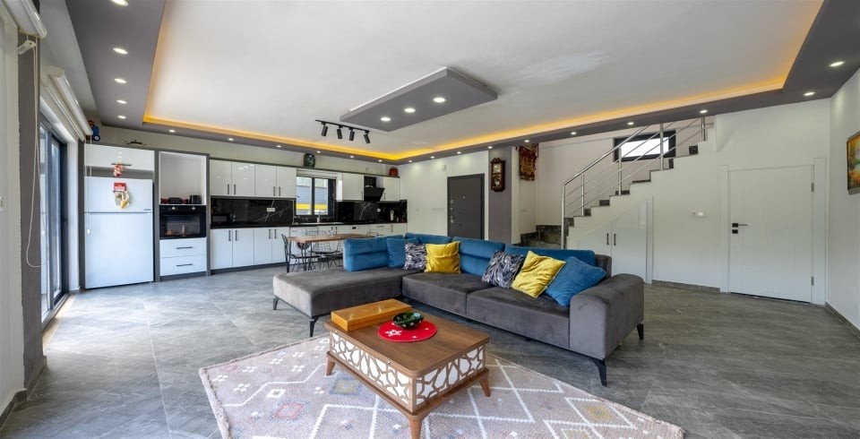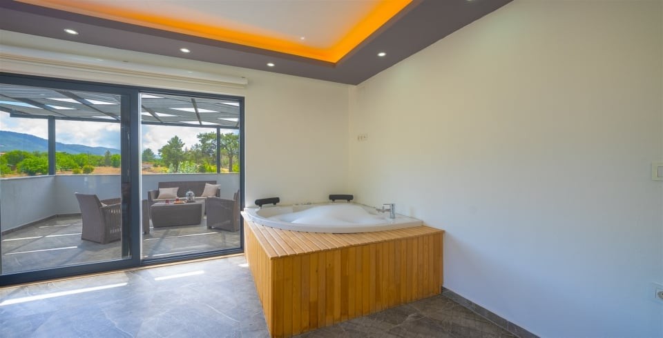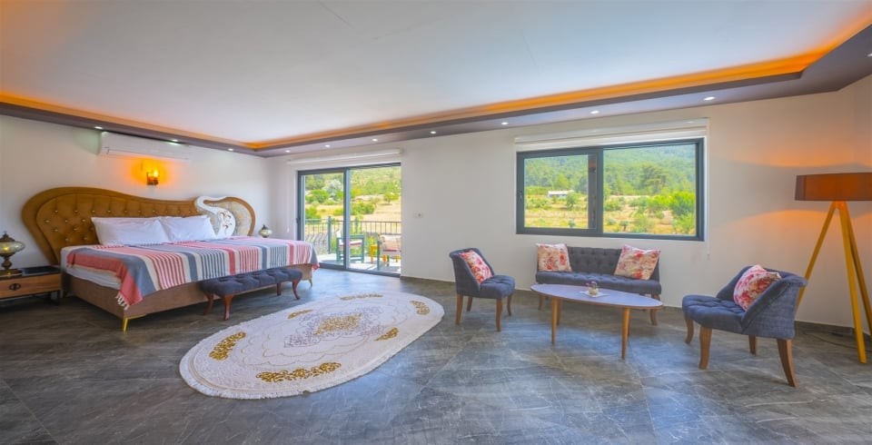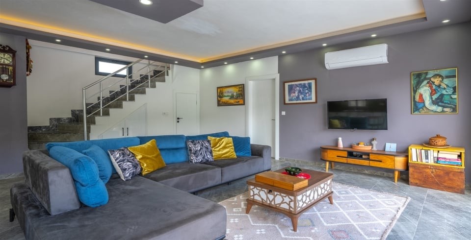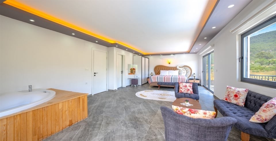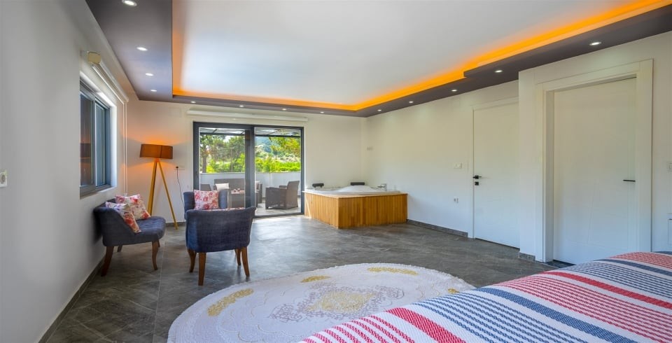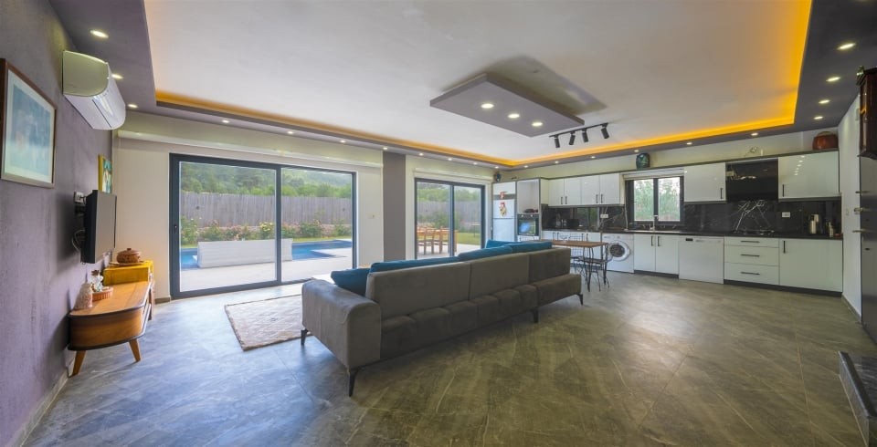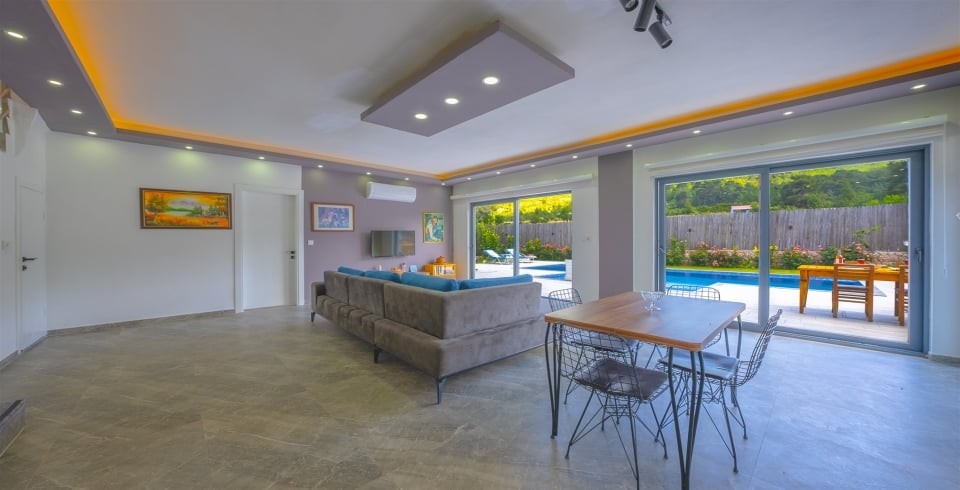 Salon : Salon içerisinde oturma grubu, TV, klima, sehpa bulunmaktadır. Havuz terasına çıkış yapılabilmektedir.