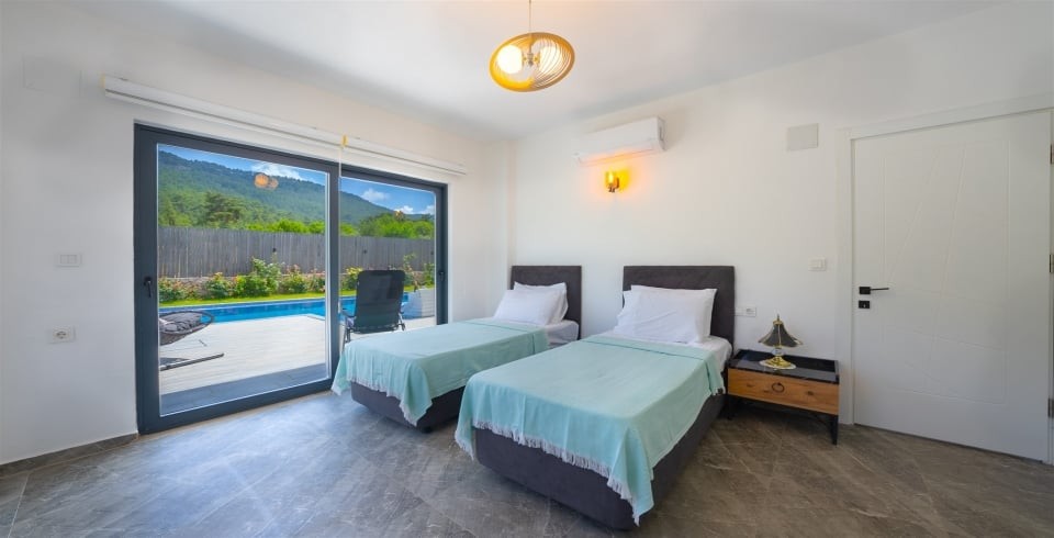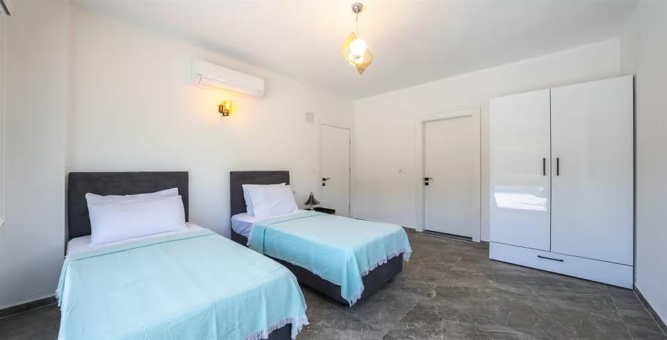 2. Yatak Odası : 2 adet tek kişilik yatak, klima, komodin, elbise dolabı, makyaj masası, banyo ve tuvalet bulunmaktadır.