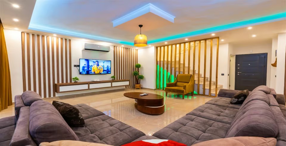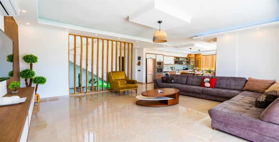 Salon : Salon kısmında; Oturma grubu, televizyon, klima, sehpa, internet ve havuz terasına çıkış bulunmaktadır.