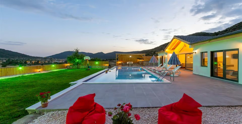 Havuz ve Bahçe : Villamızın havuz terasında , şemsiye, salıncak, yemek masası, ve barbekü bulunmaktadır.
