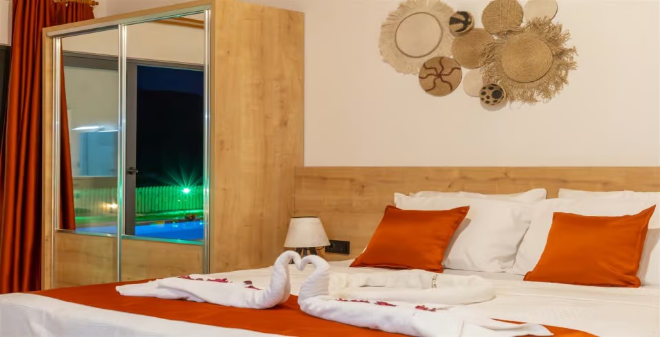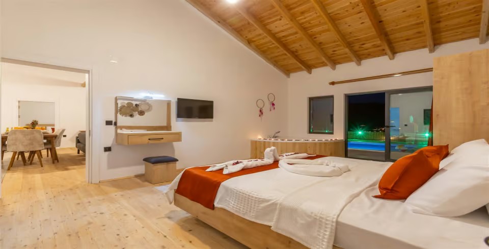 1. Yatak Odası: 1 Adet çift kişilik yatak, jakuzi, makyaj masası, elbise dolabı, komodin, klima ve tuvalet&banyo bulunmaktadır.