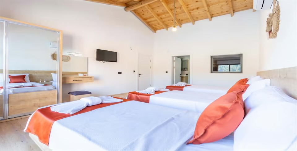 2. Yatak Odası: 3 Adet tek kişilik yatak, makyaj masası, elbise dolabı, komodin, klima ve tuvalet&banyo bulunmaktadır.