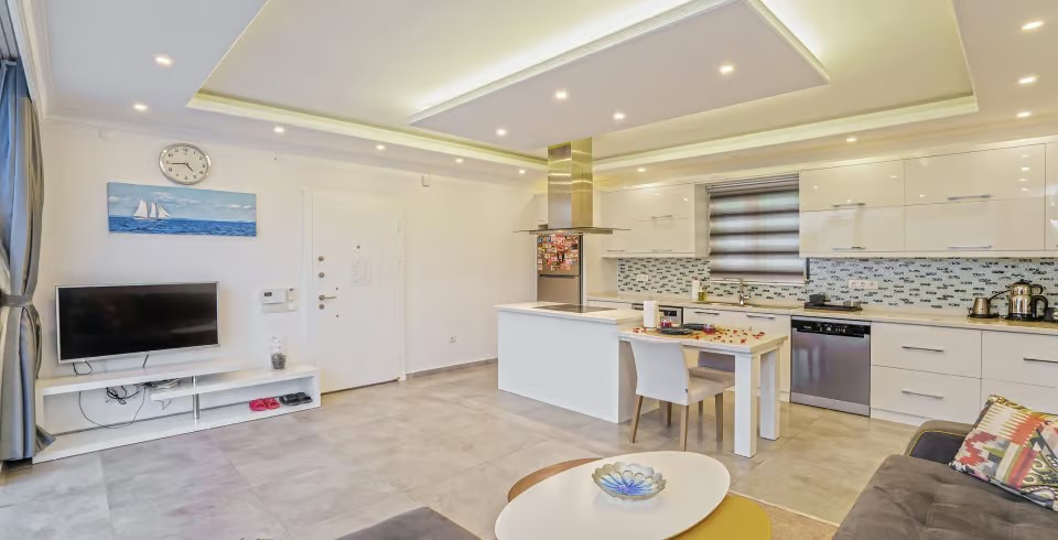 Mutfak : Amerikan açık mutfak ve salona sahip villamızın mutfağında buzdolabı, bulaşık makinası, ankastre ocak, fırın, mikrodalga, 4'lü ankastre ocak, kettle, çamaşır makinası, yemek masası ve temel mutfak araç ve gereçleri bulunmaktadır.