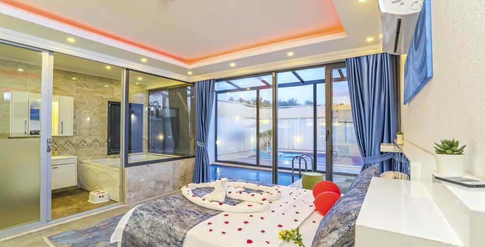 Dış alan, yüksek çitler ve çift kademeli perde sistemiyle korunaklı hale getirilmiştir. Kapalı havuzu sayesinde kış dönemlerinde de balayı tatiline uygundur. Havuz ısıtması talep üzerine günlük 750 TL ücretle sunulur; bu hizmet için girişten 2 gün önce bilgilendirme gereklidir. Villada ihtiyaç duyacağınız tüm mobilya ve mutfak ekipmanları eksiksiz olarak yer almaktadır.