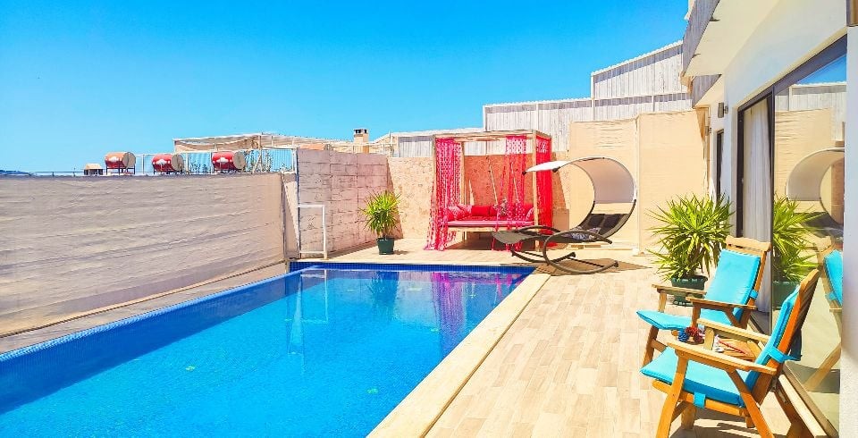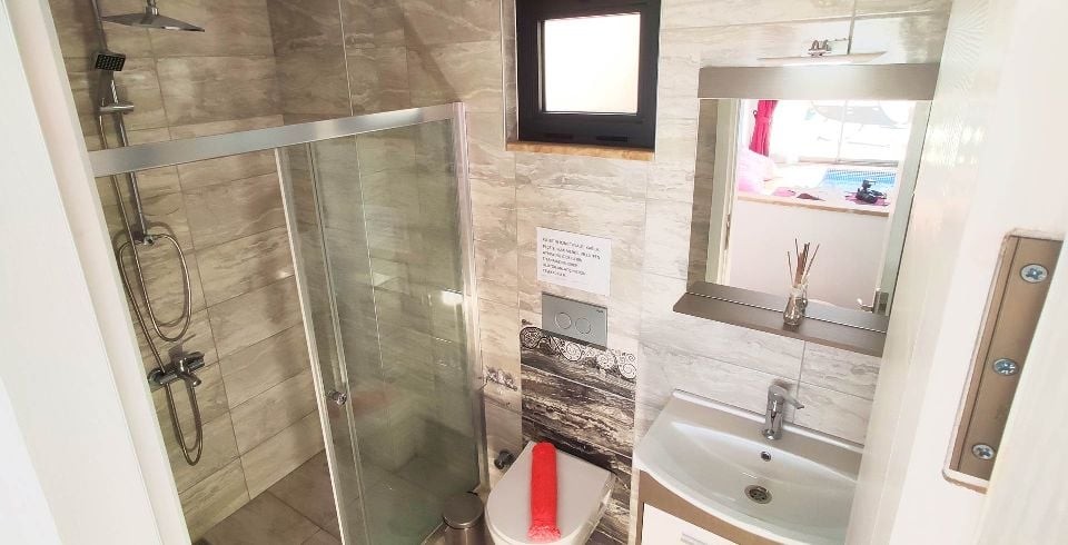 Havuz Ölçüleri : Ayrıca açık havuzda sığ havuz bölümü de bulunmaktadır. Villa içerisinde 3 m x 2,20 m 1,20 ölçülerinde kapalı ısıtmalı havuz yer almaktadır. Havuz terası korunaklı olup dışarıdan gözükmemektedir.