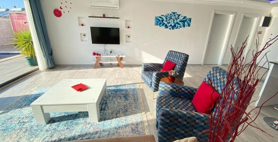 Salon : Kiralık villamızın salonunda oturma grubu, TV, uydu, internet, klima, şömine, yemek masası, sehpa bulunmaktadır. Salonumuzdan havuz terasına çıkış bulunmaktadır.