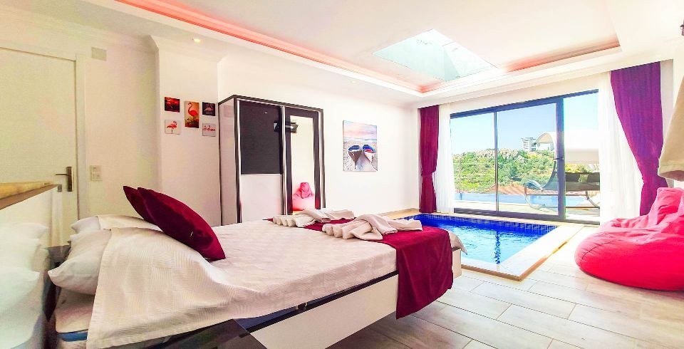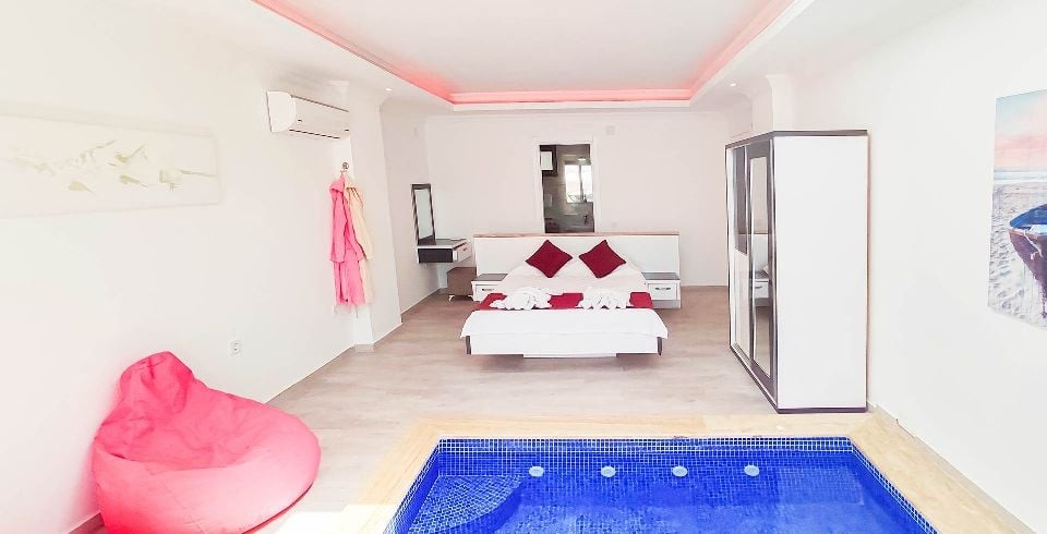 Yatak Odası : Çift kişilik süit yatak odası, klima, elbise dolabı, makyaj masası, komodin, ısıtma havuzu, banyo ve lavabo bulunmaktadır.