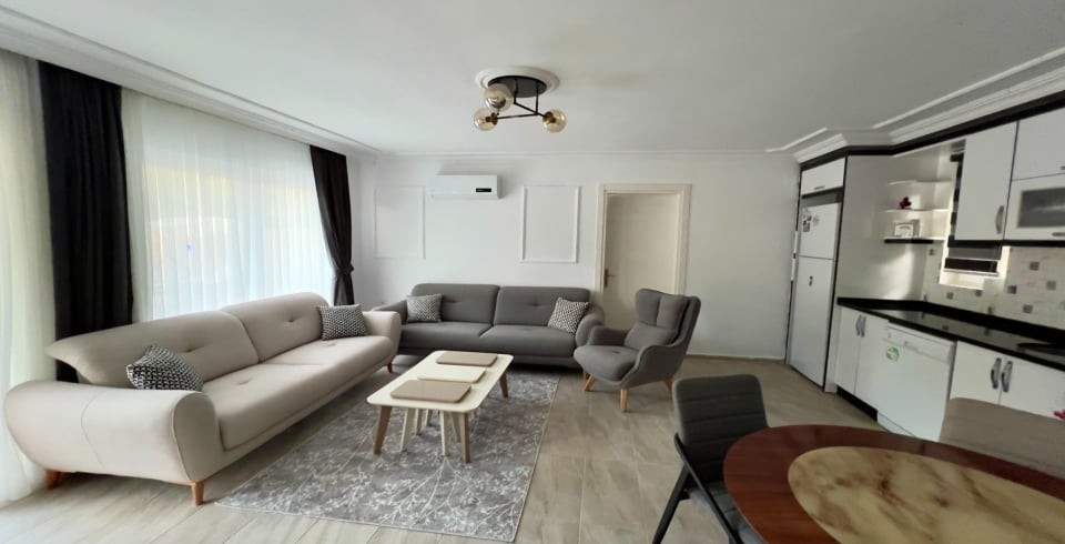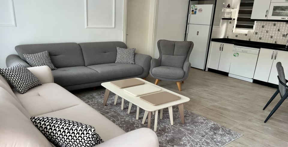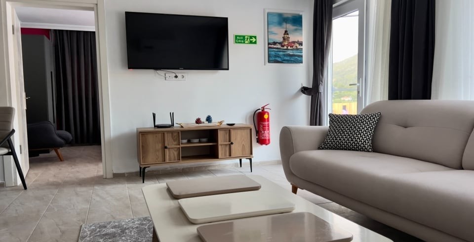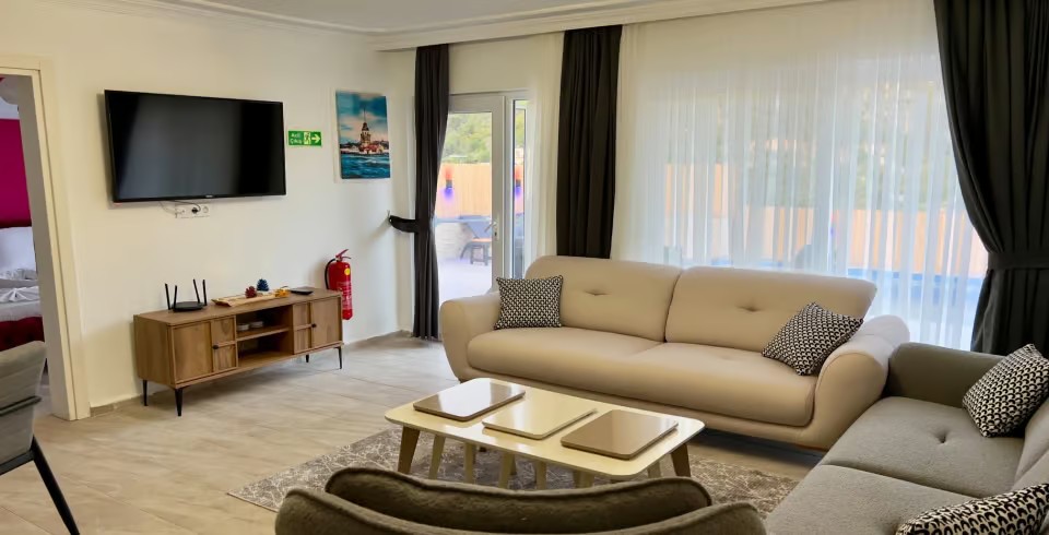 Salon : Kiralık villamızın salonunda oturma grubu, TV, uydu, internet, DVD, sehpa bulunmaktadır.