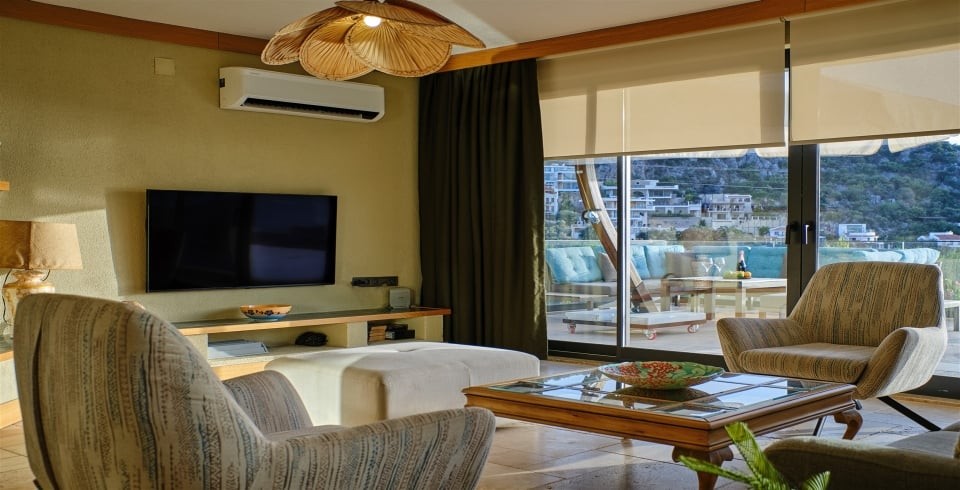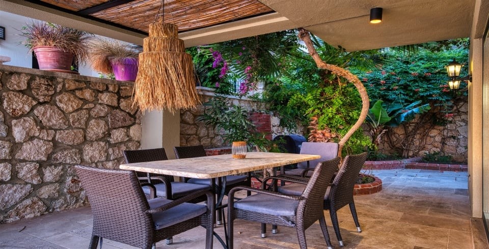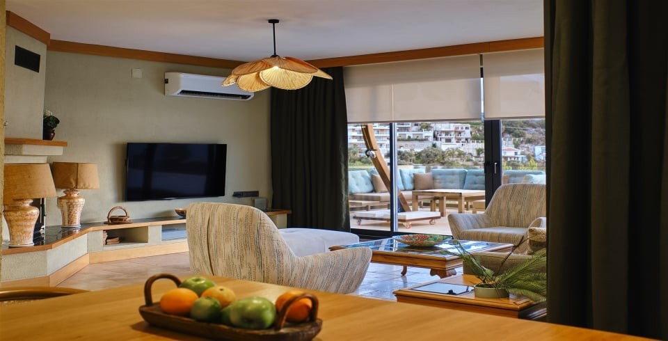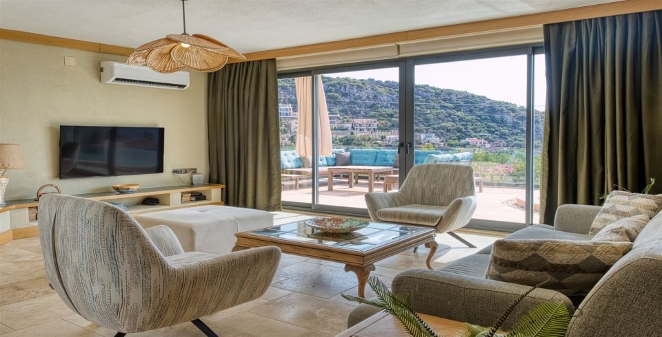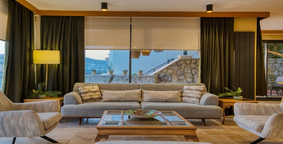 Salon : Villamızın iç dizaynı da son modaya uygun olarak modern bir şekilde tasarlanmıştır. Çeşitli dekoratif eşyalarla süslediğimiz salonumuz havuzlu bahçeye açılıyor. Villa salonunda oturma grubu, TV, internet, klima, sehpa bulunmaktadır.