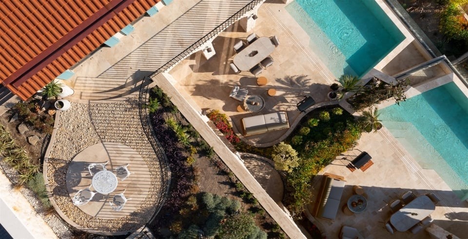 Dış mekânda özel şezlonglu yüzme havuzu, teras alanları, yemek masası, barbekü ve gölgeli köşeler mevcuttur. Bazı odalardan havuz alanına doğrudan geçiş imkânı sağlanmakta, ayrıca balkonlar manzara izleme keyfini artırmaktadır. Havuz terası ve bahçe, mahremiyet düşünülerek dış görüşe kapalı şekilde düzenlenmiştir.