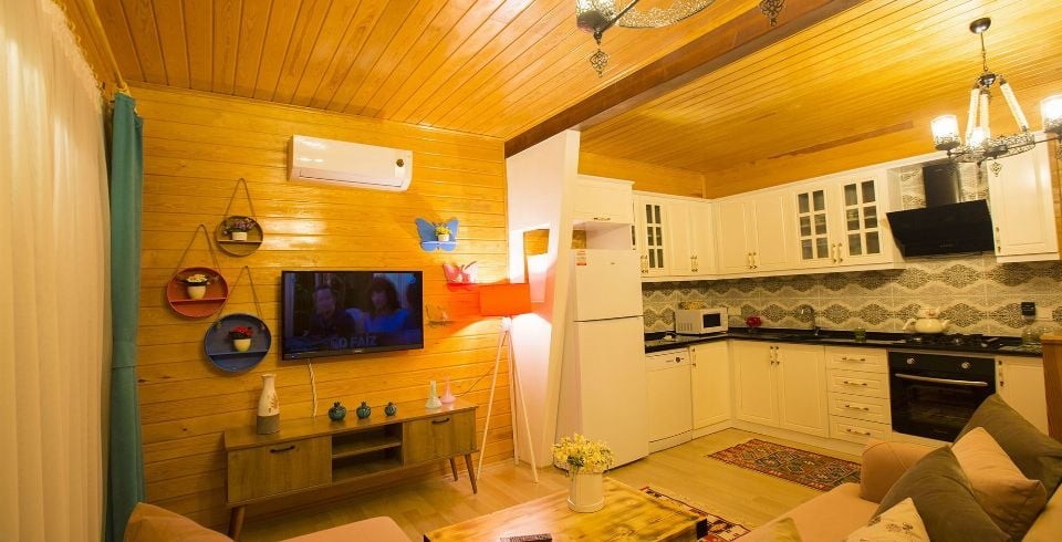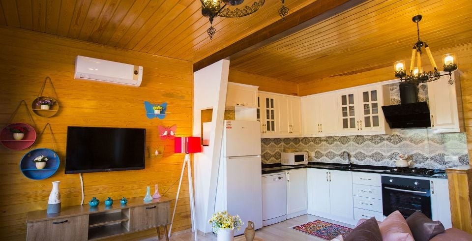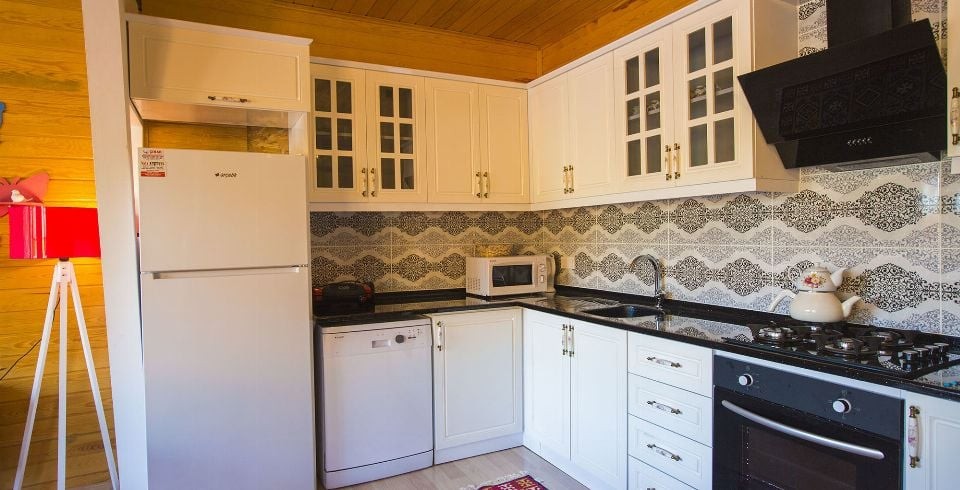 Mutfak : Villamızın özel tasarım Amerikan mutfağı ile içerisinde ihtiyacınız olan her şey bulunmaktadır. Burada, çamaşır makinası, buzdolabı, bulaşık makinası, 4 kişilik özel yemek takımı ve ufak tefek eşyalar bulunur. Çatal bıçak takımı, ocak, fırın, su ısıtıcısı, tost makinası, mikrodalga fırın bulunuyor.