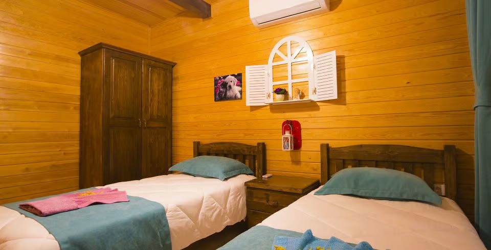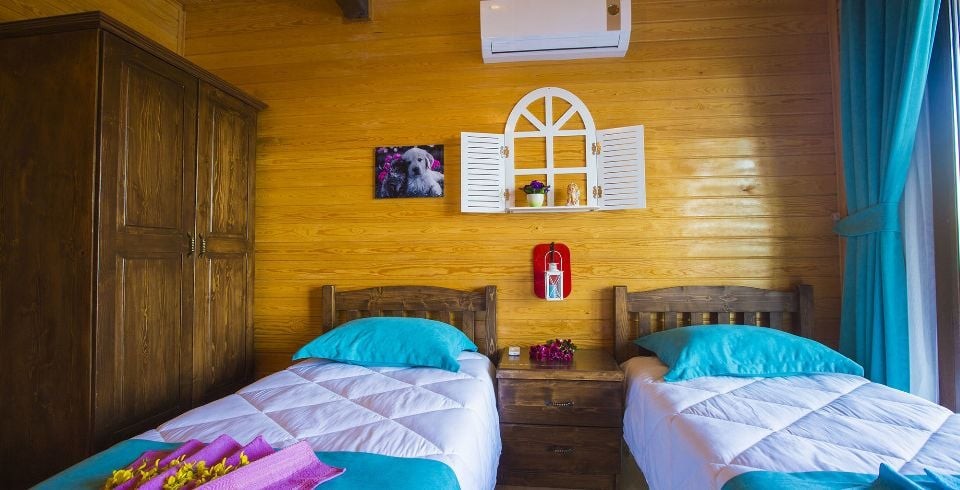 2. Yatak Odası : 2 adet tek kişilik yatak ile beraber oda içerisinde komodin, klima, elbise dolabı, makyaj masası, banyo ve lavabo bulunmaktadır. Bu odamız güneşlenmeniz için bir terasa çıkar terasta ise şezlong bulunmaktadır.