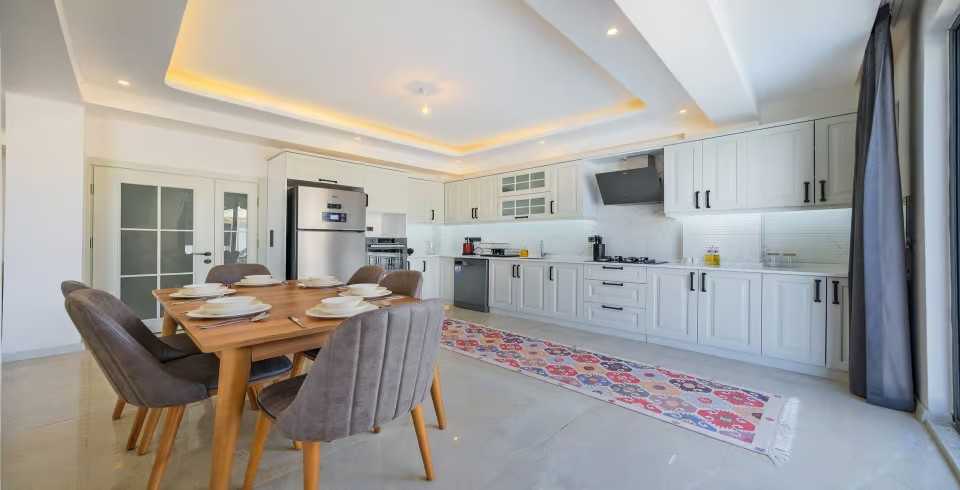 Mutfak: Villamızın mutfağında ; bulaşık makinası, buzdolabı, ankastre fırın, mikrodalga fırın, ankastre 4'lü ocak, su ısıtıcısı, ekmek kızartma makinası, tencere ve tava takımı, yemek takımı, kaşık çatal bıçak takımı, bardak takımı, yemek masası, sandalyeler ve mutfak adası bulunmaktadır.