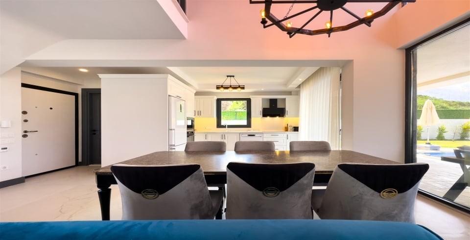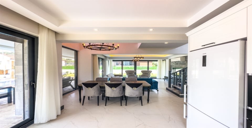 Salon: Oturma grubu, Uydu TV, 6 Kişilik yemek masası, Klima, Havuz kenarına çıkış bulunmaktadır.