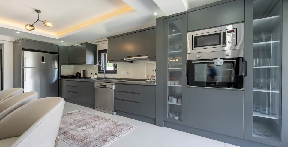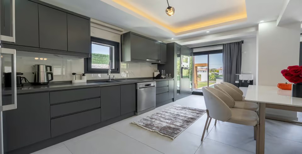 Mutfak: Açık planlı mutfak, 8 kişi ve daha fazla kişiye yetecek kadar mutfak malzemeleri, buzdolabı, fırın, ocak, mikrodalga fırın, bulaşık makinesi, çamaşır makinesi, tost makinesi, kettle ve çaydanlık bulunmaktadır..