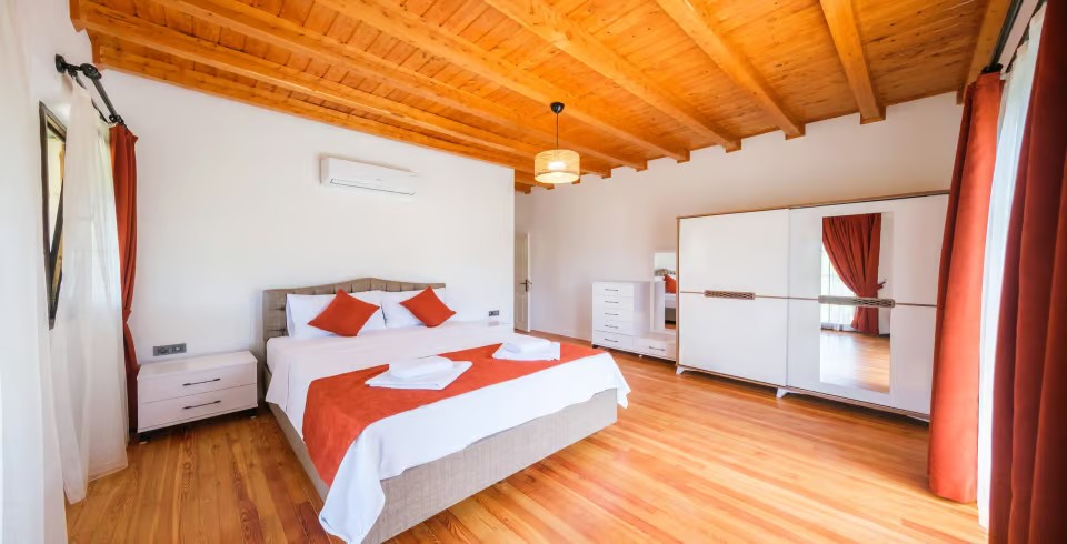 1.Yatak Odası: 1 adet çift kişilik yatak, elbise dolabı, komodin, makyaj masası, klima, banyo ve lavabo bulunmaktadır.