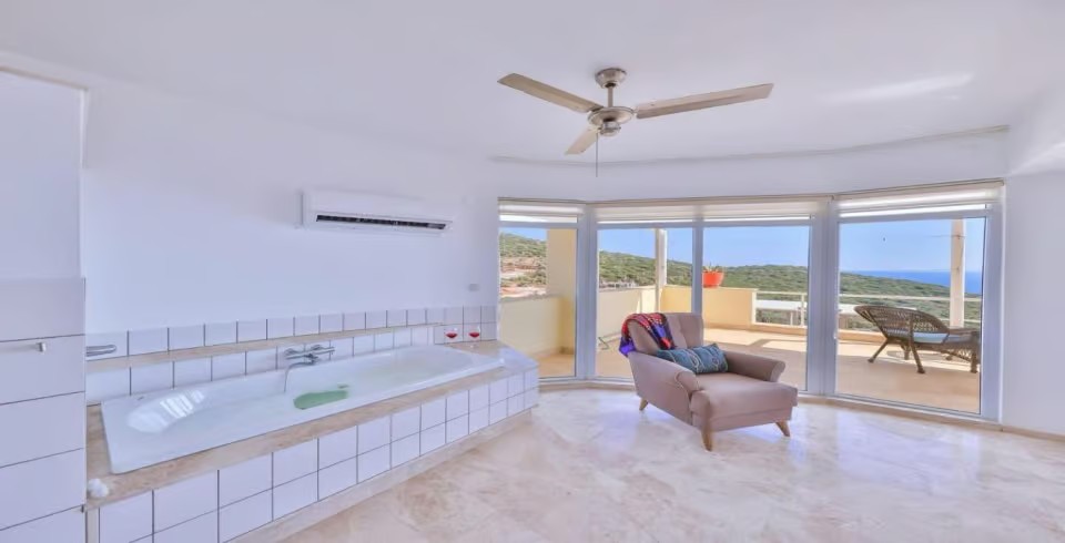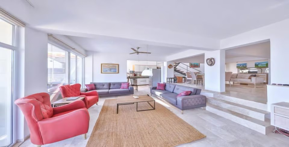 Salon : Salon içerisinde oturma grubu, TV, klima, sehpa bulunmaktadır. Havuz terasına çıkış yapılabilmektedir.