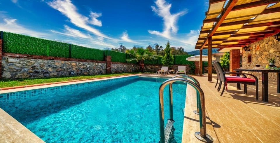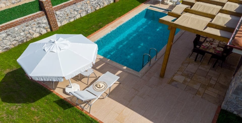 Havuz Ve Bahçe : Villamızın havuzu  korunaklı olup dışarıdan gözükmemektedir.Havuz terasında şezlong , şemsiye,salıncak,  oturma grubu ve barbekü bulunmaktadır.