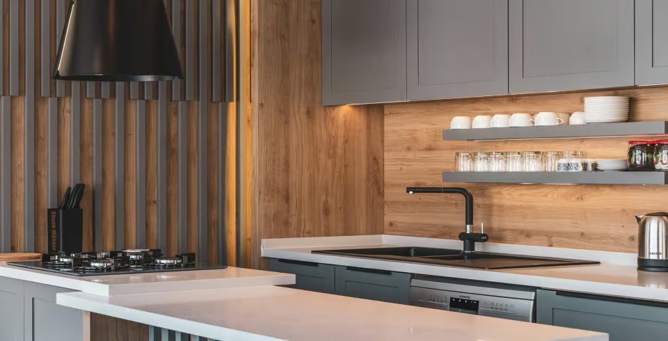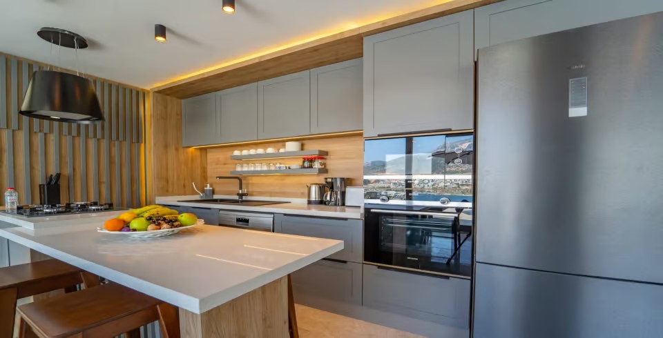 Mutfak : Modern Amerika mutfağımızda; buzdolabı, bulaşık makinesi, ankastre mikrodalga fırın ve elektrikli fırın, aspiratörlü gazlı ocak, filtre kahve makinesi, su soğutucu, tost makinesi ve su ısıtıcısı ile tam donanımlıdır. Ayrıca 3 tabureli bir kahvaltı barı da vardır. Yemek masası, 5 sandalye ve bir bank ile 8 kişiyi rahatça ağırlayabilir. Sürgülü cam kapılar, istenirse dışarıdaki bir yaşam alanı hissi vermek için her taraftan havuz terasına açılabilir.